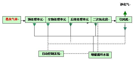 惡臭氣(qi)(qi)體從(cong)氣(qi)(qi)體收集系統排出經(jing)引風管首先進(jin)入生(sheng)物(wu)(wu)(wu)(wu)除(chu)(chu)臭裝(zhuang)置(zhi)預處理段進(jin)行隔油、溫度調節、除(chu)(chu)塵及增(zeng)濕后,進(jin)入生(sheng)物(wu)(wu)(wu)(wu)除(chu)(chu)臭主體設(she)備,廢氣(qi)(qi)中的(de)(de)污(wu)染物(wu)(wu)(wu)(wu)與生(sheng)物(wu)(wu)(wu)(wu)除(chu)(chu)臭裝(zhuang)置(zhi)的(de)(de)生(sheng)物(wu)(wu)(wu)(wu)填料(liao)上微生(sheng)物(wu)(wu)(wu)(wu)接觸,被(bei)微生(sheng)物(wu)(wu)(wu)(wu)捕獲降解、氧化,使污(wu)染物(wu)(wu)(wu)(wu)分(fen)解為無(wu)(wu)害(hai)的(de)(de)CO2和(he)H2O,未完全(quan)降解的(de)(de)難降解的(de)(de)化合物(wu)(wu)(wu)(wu)經(jing)離子氧二次氧化至(zhi)無(wu)(wu)害(hai)的(de)(de)氣(qi)(qi)體,無(wu)(wu)害(hai)氣(qi)(qi)體通過(guo)風機抽送(song)排放,產生(sheng)的(de)(de)硫酸(suan)(suan)、硝酸(suan)(suan)等無(wu)(wu)機物(wu)(wu)(wu)(wu)進(jin)一步被(bei)硫桿菌、硝酸(suan)(suan)菌分(fen)解、氧化成無(wu)(wu)害(hai)物(wu)(wu)(wu)(wu)質,無(wu)(wu)害(hai)氣(qi)(qi)體由(you)(you)風機抽出直接排放。在廢氣(qi)(qi)濃度很低(di)時,營養液循環箱中的(de)(de)營養液由(you)(you)循環泵送(song)到生(sheng)物(wu)(wu)(wu)(wu)填料(liao)床頂部(bu),均勻的(de)(de)噴淋在生(sheng)物(wu)(wu)(wu)(wu)填料(liao)上,供微生(sheng)物(wu)(wu)(wu)(wu)吸取(qu)營養物(wu)(wu)(wu)(wu)質,生(sheng)長繁殖。