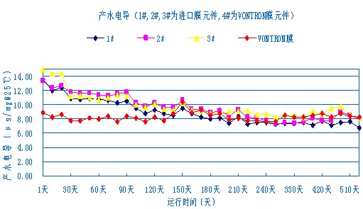 從山西鋁(lv)廠熱電分廠生(sheng)產(chan)(chan)純水改造(zao)項目成功運(yun)行可(ke)以看出(chu),用“反(fan)滲透膜(mo)法+混床(chuang)”水處理(li)工(gong)藝代(dai)替“陰陽(yang)床(chuang)+混床(chuang)”處理(li)工(gong)藝,不僅降(jiang)低生(sheng)產(chan)(chan)成本,而且可(ke)以降(jiang)低對(dui)(dui)環境的(de)污染,節約水資源。同時從匯通VONTRON LP21-8040反(fan)滲透膜(mo)元(yuan)(yuan)件(jian)與陶氏BW30-400反(fan)滲透膜(mo)元(yuan)(yuan)件(jian)幾年的(de)對(dui)(dui)比運(yun)行可(ke)以看出(chu),國產(chan)(chan)的(de)反(fan)滲透膜(mo)元(yuan)(yuan)件(jian)與國外(wai)品牌(pai)的(de)反(fan)滲透膜(mo)元(yuan)(yuan)件(jian)的(de)性能和品質已相差無幾,在相同的(de)完(wan)善預(yu)處理(li)條件(jian)下,系統(tong)均能長期穩定運(yun)行。