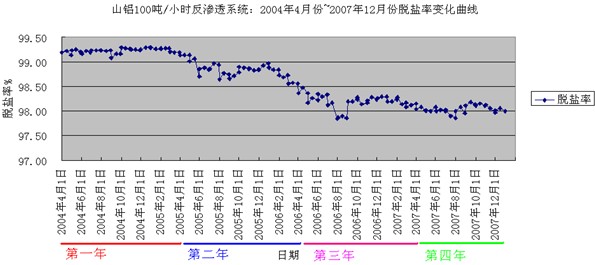 運行3年后VONTRON LP21-8040膜系統(tong)的(de)脫(tuo)鹽率及(ji)產水量的(de)變化(hua)情況: