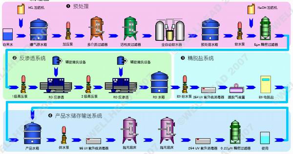 超(chao)純水系(xi)統分(fen)為預處理(li)、反(fan)滲(shen)透系(xi)統、精脫鹽系(xi)統及產品水儲存輸送(song)系(xi)統等部(bu)分(fen)。