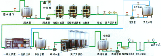 說明:進水含鹽量在500mg/L以下時,一般采用離子交換除鹽。陽離子交換樹脂和水里的陽離子起交換作用,陰離子交換樹脂和水里的陰離子起交換作用,從而降低水里的含鹽量。其出水水質純度高,電導率0.1цs/cm,溶解固體1-4mg/L。