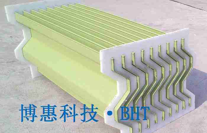 武漢博惠節能環保工程有限公司生產的除霧器有4種板片結構形式,折線型3通道除霧器組件通常用在一級(下層)除霧器中擔負著粗顆粒液滴的分離除霧重任,其除霧效率較高,但是阻力降也相對高些,不過總體還是低于200pa,這種板片結構形式最主要的問題就是清洗困難,所以一般用于不易結垢的場合。如果脫硫工藝采用石灰石膏法,還是建議采用流線型2通道不帶鉤除霧器組件或折線型2通道除霧器組件;作為一級除霧器板片結構形式。