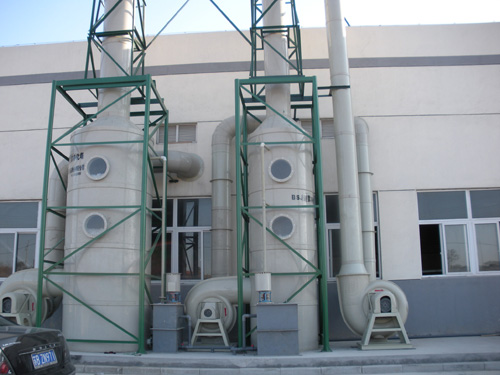 酸性氣體從塔體下方進氣口進入酸霧凈化塔,在通風機的動力作用下,迅速充滿進氣段空間,然后均勻地通過均流段上升到第一級填料吸收段。在填料的表面上,氣相中酸性物質與液相中堿性物質發生化學反應,反應生成物質(多為可溶性酸類)隨吸收液流入下部貯液槽。未完全吸收的酸性氣體繼續上升進入第一級噴淋段。在噴淋段中吸收液從均布的噴嘴高速噴出,形成無數細小霧滴,與氣體充分混合接觸,繼續發生化學反應,然后酸性氣體上升到二級填料段、噴淋段進行與第一級類似的吸收過程。塔體的最上部是除霧脫水段,氣體中所夾的吸收液霧滴在這里被清除下來,經過處理后的潔凈空氣從酸霧凈化塔上端排氣管排入大氣。