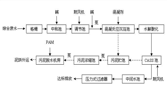 桂林南藥股份有限公司污水站于2005年新建,所采用的主體工藝為中和+混凝沉淀+水解酸化+CASS+微絮凝過濾,主要處理在生產過程中產生的母液、清洗水、鍋爐廢水、冷卻水排污和車間清掃廢水等,日處理能力3000m3,工程投資 826萬,運行成本0.9~1.0元/噸水,經過處理后,廢水達到了(GB8978-1996)一級排放標準。