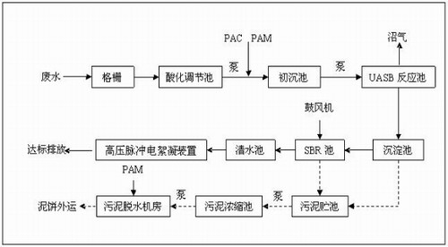 寧夏銀廣夏制藥廠污水站采用物化、厭氧UASB,好氧SBR和高壓脈沖電絮凝工藝。日處理能力720m3,工程總造價為795.41萬元,經過處理后,廢水達到了(GB8978-1996)二級排放標準。
