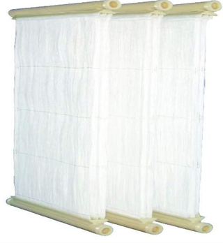 中空纖維膜是專門為膜生物反應器(MBR)配套的膜組件,采用聚丙烯中空纖維外壓式超濾膜纖維制成。膜生物反應器(Membrane Bioreactor,簡稱MBR)是高效膜分離技術與活性污泥法相結合的新型水處理技術。中空纖維膜的應用取代活性污泥法中的二沉池,進行固液分離,有效的達到了泥水分離的目的。膜的高效截留作用,可以有效截留硝化菌,使其完全截留在生物反應器內,使硝化反應得以順利進行,有效去除氨氮,避免污泥的流失,同時可以截留一時難于降解的大分子有機物,延長其在反應器的停留時間,使之得到最大限度的分解。