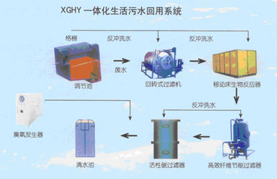 XGHY一體化生活污水回用系統采用先進、成熟的生物膜反應器為核心的處理設備。該反應器的生物填料有陽離子纖維經特殊工藝加工而成,理論表面積為12000M2/M3(填料),并且克服了常規軟性填料容易結團的弱點。因此,反應器內有很高的生物濃度(VSS可達30q/1)和較大的容積負荷(C0D10~40KG/M3·d)。生物膜反應器兼并有一定的過濾功能在水處理工藝中可以不設二沉池,縮小了建筑面積和減少了工程投資。二、工藝流程