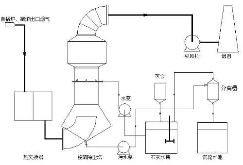 該系統主要由脫硫除塵器,風機和水系統三部分組成。經加速的待處理氣體,首先形成旋轉氣流,與喘流下的液體相遇,氣體高速旋切液體,并將液體托住反復破碎,液體變得越來越細微,氣液充分混合,并在恰當的參數匹配下形成一段動態穩定的液滴懸浮層,完成物理、化學的凈化過程,當氣體的托力與液滴重力平衡后,新形成的懸浮液取代飽和懸浮液體,進行新的凈化過程,飽和液體帶著捕集的雜質排出,從而煙氣得到凈化。