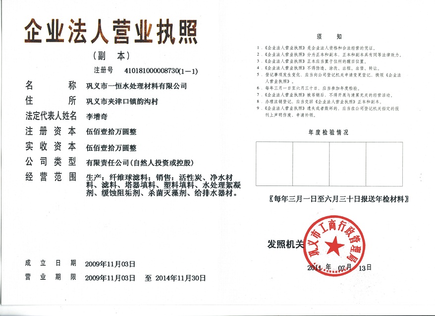 鞏義市一恒水處理材料有限公司營業執照