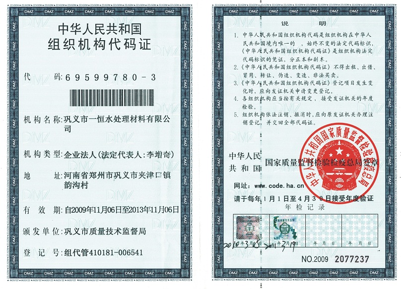 鞏義市一恒水處理材料有限公司組織機構代碼證