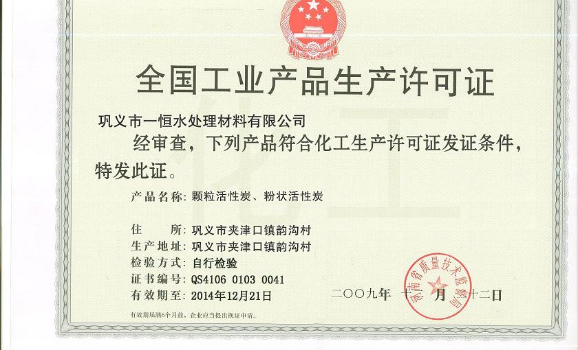 鞏義市一恒水處理材料有限公司活性炭生產許可證