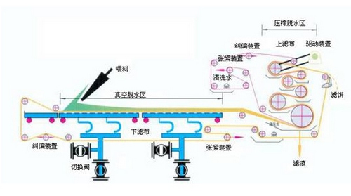 二次脫(tuo)(tuo)水(shui)(shui)采用壓榨(zha)脫(tuo)(tuo)水(shui)(shui),物料在真空抽濾后形成濾餅(bing),濾餅(bing)在上(shang)、下(xia)濾布(bu)的夾帶下(xia),隨即進(jin)入壓榨(zha)脫(tuo)(tuo)水(shui)(shui),壓榨(zha)脫(tuo)(tuo)水(shui)(shui)后濾餅(bing)含水(shui)(shui)率再次降低3-5%。