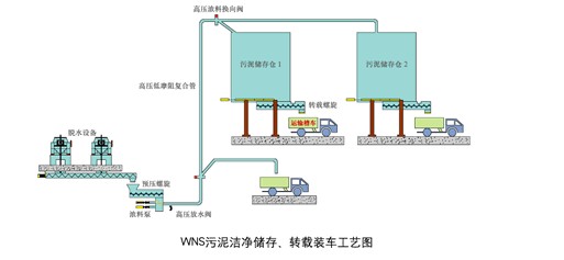 WNS污泥潔凈儲存、轉載裝車系統主要由預壓螺旋、濃料泵、高壓低摩阻復合管、高壓濃料換向閥.污泥智能儲存倉、轉載螺旋、電控系統等設備組成,是集污泥攪拌、處置、儲存、裝車等功能于一體的高新技術產品。