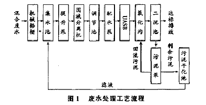 針對啤酒廢水可生化性較好的特點(BOD5/CODCr-0.6),可采用生化法為主的處理工藝。生化法一般可分為好氧和厭氧。采用單一的好氧工藝,則存在著能耗高、占地面積大、運行費用高等弊端。升流式厭氧污泥床反應器(UASB反應器)具有不需氧、能耗低、污泥產量少等特點。本次設計采用厭氧和好氧相串聯的方式,厭氧采用內循環UASB技術,好氧處理用地有一處狹長形池塘,為了降低土建費用,因地制宜,采用氧化溝工藝。其工藝流程見圖1。