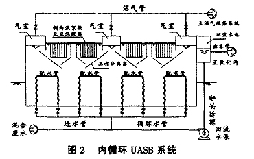 內循環UASB技術是在普通UASB技術的基礎上增加一套內循環系統,它包括回流水池及回流水泵。UASB反應器的出水水質一般都比較穩定,在回流系統的作用下重新回到配水系統。這樣一來能提高UASB反應器對進水水溫、pH值和COD濃度的適應能力,只需在UASB反應器進水前對其pH和溫度做一粗調即可。