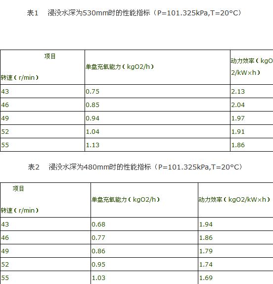 單盤標準清水充氧能力及動力效率見表1~2所示:
