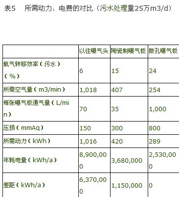 表5中列出了微孔曝氣板與以往曝氣頭和陶瓷制曝氣板動力及電費消耗的對比情況。