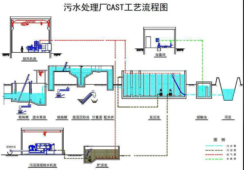 CAST工藝是一種“充水和排水”活性污泥法,廢水按一定周期循環處理,其每一個循環有下列各個附段組成:充氣/曝氣、充水/沉淀、撇水、閑置。各個階段組成一個循環,并不斷重復循環,開始時,由于充水,池中水位由某一最低水位開始上升,在經過一定時間的曝氣和混合后,停止曝氣,以使活性污泥進行絮凝并在一個靜止的環境中沉淀,在完成沉淀階段后,由一個移動式撇水堰排出已處理的上清液,使水位下降至池子設定的最低水位,然后再重復上述全過程。