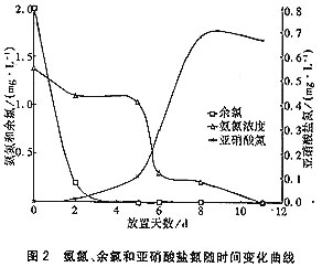 自來水中含高濃度的氨氮也可能產生亞硝酸鹽的問題,尤其是在我國多層建筑廣泛采用的屋頂水箱中。屋頂水箱容易受到二次污染,也容易造成死水,使自來水在水箱中停留較長時間才被用戶使用。用含氨氮的自來水廠濾后水加氯后進行貯放試驗,結果見圖2。試驗水樣(濾后水)含氨氮1.38mg/L,加氯后水樣的余氯為2.0mg/L,密閉貯存于5L棕色瓶內,放置在室內環境中,檢測時從中取出少量水樣分析余氯、氨氮和亞硝酸鹽氮。試驗期間水溫從25℃逐漸升高至27℃。