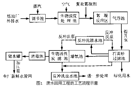 廢(fei)水回用(yong)(yong)工(gong)(gong)(gong)程(cheng)將充分利用(yong)(yong)原(yuan)裝(zhuang)置(zhi),根據(ju)現場情況(kuang),工(gong)(gong)(gong)藝路線略(lve)做調(diao)整:沉(chen)淀工(gong)(gong)(gong)序由原(yuan)有氣(qi)浮池(chi)替代,臭氧(yang)(yang)氧(yang)(yang)化工(gong)(gong)(gong)序暫用(yong)(yong)增氧(yang)(yang)處理代替,預留臭氧(yang)(yang)發生裝(zhuang)置(zhi)和(he)氣(qi)水混(hun)合設(she)施的位置(zhi)。新建砂濾池(chi)、炭濾池(chi)(含(han)增氧(yang)(yang)池(chi))等構筑物。廢(fei)水回用(yong)(yong)工(gong)(gong)(gong)程(cheng)的工(gong)(gong)(gong)藝流(liu)程(cheng)見圖1。