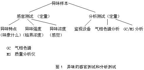 解決異(yi)味(wei)(wei)問題始(shi)于分(fen)析(xi)氣(qi)體(ti)樣(yang)(yang)本。人們用(yong)鼻子確定各(ge)種(zhong)異(yi)味(wei)(wei)的(de)臨界(jie)濃(nong)(nong)度。沒有濃(nong)(nong)縮的(de)樣(yang)(yang)本需使用(yong)感覺分(fen)析(xi),異(yi)味(wei)(wei)氣(qi)體(ti)通常被收(shou)集到玻璃(li)瓶或塑料袋中。濃(nong)(nong)縮的(de)樣(yang)(yang)本使用(yong)氣(qi)相色譜分(fen)析(xi)法。異(yi)味(wei)(wei)氣(qi)體(ti)的(de)混合物(wu)必須(xu)經過濃(nong)(nong)縮,因為使用(yong)氣(qi)相色譜時必須(xu)使氣(qi)體(ti)濃(nong)(nong)度達到一(yi)定的(de)程度。這兩種(zhong)情況,樣(yang)(yang)本必須(xu)仔細保存以免污染。關于異(yi)味(wei)(wei)的(de)感觀測(ce)試和分(fen)析(xi)測(ce)試見(jian)圖1所示(shi)。