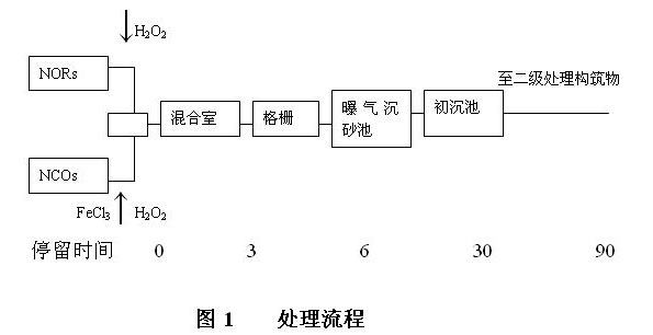 該污水處理廠是一座二級處理廠,處理能力約為164*104m3/d。該廠采用強化初沉(FeCl3和陰離子聚合物)的措施以最大限度地去除BOD。研究表明,預處理構筑物中的硫化物有兩大主要來源:NORs和NCOs收集系統(每個系統流入的H2S占處理廠總負荷的45%)。氣候溫和時系統內的液相硫化物濃度約為2.5-4.5mg/L,進入預處理構筑物洗滌器的硫化物濃度約為125-200mg/L.化學藥劑投加點及其停留時間見圖1.