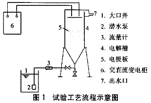 試驗的主要裝置和儀器:電凝聚器、攪拌機、潛水泵、GDS-3型光電式濁度儀、比色管等,其中電凝聚器主要由電解槽、電極板和交直流變電柜組成。電極板陽極采用純鋁板,厚為3 mm、彎折角度為90°、彎折邊長為20 mm;陰極采用不銹鋼板,厚為0.8 mm,每塊有效面積為0.55m2。