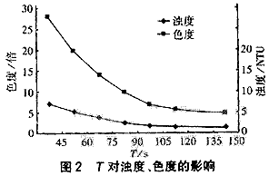 b.T為90 s。此時出水濁度、色度都明顯低于前兩個水平,但T=90 s在試驗的邊界點上。為尋求最佳的停留時間,需擴大試驗范圍(見2.2節)。