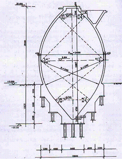 該消化池池體分為上部薄殼和下部厚殼兩部分。地面以上為薄殼部分,高度為29m,最大內徑為24m,殼體壁厚為變厚度,最大處為700mm,最小處400mm,地面以下深15m,基礎采用直徑為800mm鉆孔灌注樁,池壁水平向及垂直向均采用低松馳高強度鋼絞線施加預應力。水平向采用HM型游動錨張拉錨固體系,豎向采用OVM型張拉錨固體系。該工程1993年11月份完成了閉水試驗和池體應力測試。圖1-1為池體的豎向剖面圖。