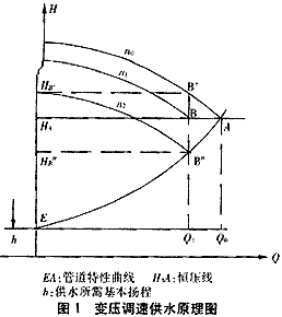 由圖1可見,當流量從Q0減為Q1時,如采用恒速泵則揚程升至HB′,此時B′B″段的揚程是多余的;如采用恒壓變頻調速泵則其轉速將由原來的n0下降為n1以維持恒壓HA(對應的揚程為B點),此時BB″段的揚程是多余的,但B′B″>BB″,顯見恒壓調速比恒速供水節能。