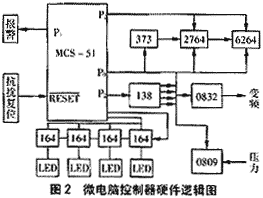 其中,0809(為A/D轉換)用以采樣水泵出口壓力;0832(為D/A轉換)用于控制變頻器以調整水泵轉速,串口定為方式0,擴展為用來實現4位數碼管顯示;2764及6264為擴展的程序存儲器及數據存儲器,2764存放程序及智能壓力設定的有關表格。
