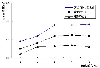 在經次氯酸鈉脫色后的污水中,在各混凝劑最佳pH條件下投加不等量混凝劑,測定污水的CODcr濃度,實驗結果圖5所示。