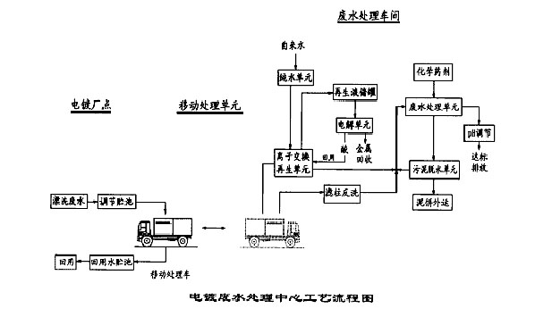 廢水處理車間由離子交換再生單元、電解單元、純水單元、廢水處理單元、污泥脫水單元等組成。離子交換樹脂在現場達到飽和后,流動處理裝置由拖車運回"中心"廢水處理車間完成中心處理部分。