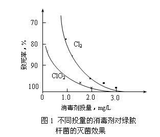 我們研究了ClO2對水中細菌的殺滅效果,結果表明:ClO2對水中金黃色葡萄球菌、綠膿桿菌、枯草芽孢桿菌、藤黃八迭球菌、痢疾桿菌、沙門氏菌和志賀氏菌等多種致病菌具有優良的殺滅效果(如ClO2對綠膿桿菌的滅菌效果見圖1),并明顯好于Cl2。