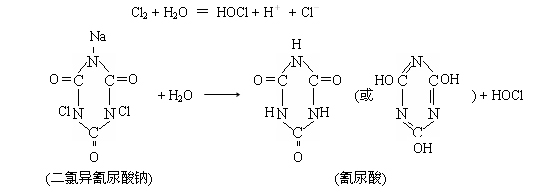 含氯制劑,包括氯(液氯(Cl2)、NaClO和Ca(OCl)2•3H2O等)、二氯異氰尿酸鈉和三氰異氰尿酸及二氧化氯ClO2。前3種含氯制劑分別稱為第一、第二和第三代消毒劑,而ClO2稱為第四代消毒劑。前3種含氯制劑溶于水后均產生HOCl,例如: