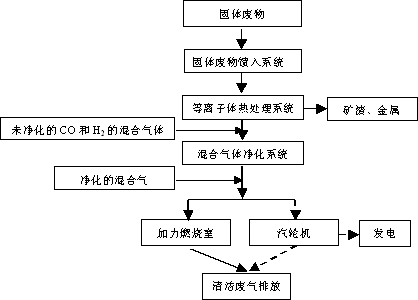 通過第二氣化室處理后的混合氣體經過凈化系統后,成為只含H2和CO的混合氣體,加力燃燒室在1000○C溫度環境下對H2和CO的混合氣體進一步進行處理,以確保無有害的混合物產生,比如二氧芑和呋喃等,最后排放到空氣中。當然也可以取消加力燃燒室而利用這些混合氣體去驅動汽輪機發電。