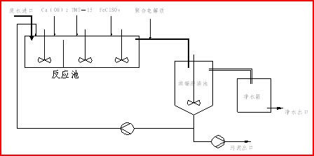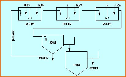 先在廢水中加入石灰乳或其它堿性化學試劑(如:NaOH等),將pH值調至6~7,為后續處理工藝環節創造良好的技術條件,同時在該環節可以有效去除氟化物(產品CaF2沉淀)和部分重金屬。然后加入石灰乳、有機硫和絮凝劑,將pH升至8~9,使重金屬以氫氧化物和硫化物的形式沉淀。