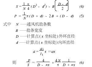 在權衡各方面因素后,通風機采用了6 根肋條, 并在肋條、外環及圓錐中充以容重為35kg/ m3 的防水超細玻璃棉,外覆厚度為3mm的不銹鋼板,鋼板上開有直徑為5mm 的圓孔,穿孔率為24 % ,在鋼板下敷設一層玻璃布以保護玻璃棉。