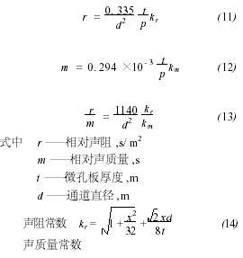 同時微穿孔板可以看成大量微管的并聯。若空間距比孔距大得多,可假設各孔(即各微管) 的特性互不影響,微穿孔板的聲阻抗簡單地等于單孔的聲阻抗除以孔數。另一方面,如果空間距比聲波長小得多時,孔間板面對聲波的反射也可忽略, 可以應用金屬微穿孔板的公式[1] :