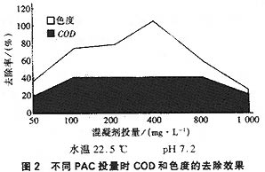混凝的目的是去除滲濾液中的COD和部分重金屬離子,以COD的去除作為主要考察對象和指標。混凝試驗過程中先對不同類型的混凝劑進行篩選,最后選擇具有高效、低耗、價廉及對pH適應性較好的聚合氯化鋁(PAC)作為混凝劑。