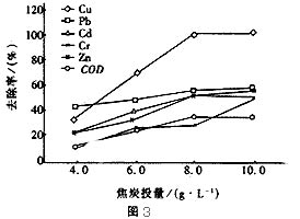由圖可見,通過焦炭吸附后,各重金屬離子及COD均得到較大幅度的去除。去除率隨焦炭投量的增加而提高。當焦炭投量為8~10g/L時(試驗條件:溫度 22.5℃,原水pH6.8,吸附時間120min),對Cu、Pb、Cd、Cr、Zn和CODCr的去除率分別為近100%、 55.0%~56.4%、51%、28.2%~48.7%、51.1%~54.9%、34.4%~35.0%。焦炭對Cu具有極好的吸附性能,對Cr的去除率則較低。