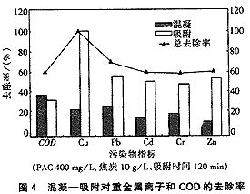 研究表明,PAC對重金屬離子有一定的處理效果。據報道,混凝過程中由于較快速攪拌而引起的充氧促進了重金屬離子的氧化,利于它們在絮體表面的吸附。由于滲濾液中的有機物量大、種類多,它們將與重金屬離子在絮體表面的吸附發生競爭而影響后者的去除。此外,滲濾液的pH值在中性附近,重金屬離子大多處于離解狀態,導致上述作用更為明顯。