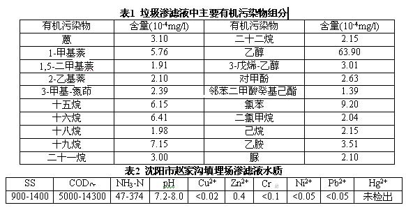 (1) 滲(shen)濾液水質(zhi)極為復雜,污(wu)(wu)(wu)染物(wu)(wu)種類(lei)(lei)繁多(duo)、危害大(da)。滲(shen)濾液中不僅含(han)有耗氧有機污(wu)(wu)(wu)染物(wu)(wu),還(huan)含(han)有重(zhong)金屬(shu)和植(zhi)物(wu)(wu)營養素等(deng)多(duo)種有毒有害物(wu)(wu)質(zhi)及生物(wu)(wu)污(wu)(wu)(wu)染物(wu)(wu),如病菌、蟲(chong)卵(luan)等(deng)。已有93 種有機污(wu)(wu)(wu)染物(wu)(wu)被檢(jian)出,含(han)量(liang)較多(duo)的有烴類(lei)(lei)及其衍(yan)生物(wu)(wu)、酸酯類(lei)(lei)、醇酚類(lei)(lei)、醛酮類(lei)(lei)和酰胺類(lei)(lei)等(deng),其中許多(duo)污(wu)(wu)(wu)染物(wu)(wu)是我(wo)國(guo)環境優先控制污(wu)(wu)(wu)染物(wu)(wu),表1 列出部(bu)分(fen)含(han)量(liang)大(da)的有機污(wu)(wu)(wu)染物(wu)(wu)。另外城市垃圾填埋場滲(shen)濾液中重(zhong)金屬(shu)離子(zi)的濃(nong)度通常比較低,如沈陽市趙家溝填埋場滲(shen)濾液的水質(zhi),見表2