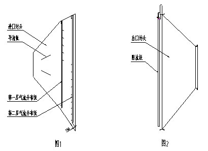 2、電除塵器進口封頭內設置兩層氣流分布多孔板。通過增加阻力,把分布板前面大規模的紊流分割開來,在分布板后面形成小規模紊流,而且在短距離內使紊流的強度減弱。使原來方向不與氣流分布板垂直的氣流變為與板垂直。具體氣流分布板布置形式見圖1。