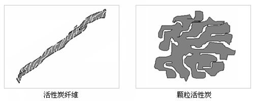 ACF是一種纖維狀的活性炭,其微孔在其制造過程中由水蒸氣刻蝕在一根根比頭發絲細很多的纖維絲上,其微孔孔道長度比GAC小1到2個數量級。這樣,其吸附解吸速度比GAC快1到2個數量級。其微孔結構示意圖與GAC微孔結構示意圖見下圖: