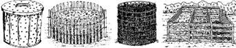 容器(如下圖):可以使用堆垛法用簡單的堆垛進行堆肥,但用一個容器或箱柜會有利于堆垛保持熱量和水分,并看起來更整潔。堆肥容器可以由金屬或廢木料制作而成,但非木質材料的效果更好。容器的開口要足夠大,允許大量的空氣進入。自制的簡單堆肥堆制裝置可以是1m×1m×1m立方形,也可以是直徑在1.5m 左右的圍欄(由木條捆扎或用金屬網做材料),或無底的塑料或木桶(只需在桶壁上鉆幾個通氣孔即可)。條件許可的話,也可以用水泥和紅磚堆砌一個簡單的三邊箱柜,留出第4邊以利于翻堆垛。為了防止雨水淋失養分,這些容器都需要有能遮擋雨水的蓋子。