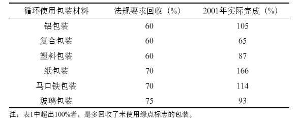 實踐表明,DSD的運作取得了卓越成效,2001年各類包裝廢棄物回收利用指標均達到法規規定(如表1)。