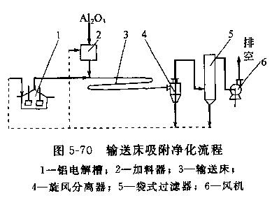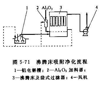 氧化鋁與煙氣中的氟化氫接觸后,吸附反應速度很快,反應幾乎在0.1S內即可完成。干法吸附凈化流程有輸送床吸附工藝和沸騰床吸附工藝等。