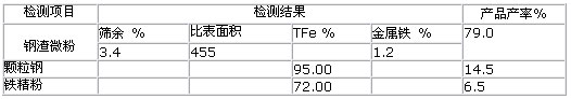 按照鋼渣微粉現推薦標準,鋼渣微粉指標:比表面積≥420m2/kg,金屬鐵含量≤2%,各項性能指標符合摻合料標準。按照選礦標準標,粒鋼的TFe≥95%,鐵精粉TFe≥65%。
