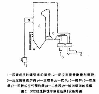 圖2示出SNCR系統簡圖。研究發現,最佳還原反應溫度為980℃至1150℃范圍。故SNCR法反應劑向爐膛上部注入(見圖2)。尿素和熾熱煙氣摻和后便釋出氨(NH3)和煙氣產生復雜化學反應。通常,少量氨會還原成NO,少量氧化成NOX,還有若干來不及反應隨煙氣一起流經尾部對流受熱面進入煙囪排向大氣。當不合上述溫度和混合不勻、反應時間不足時,氨利用率下降漏損量增大。